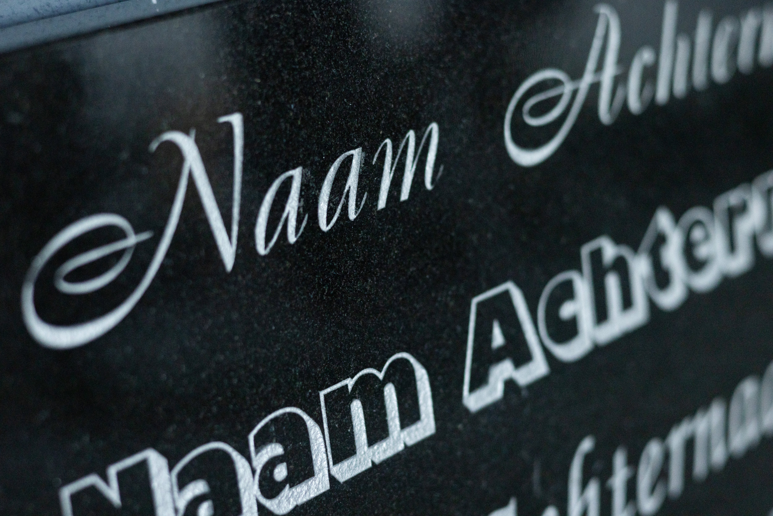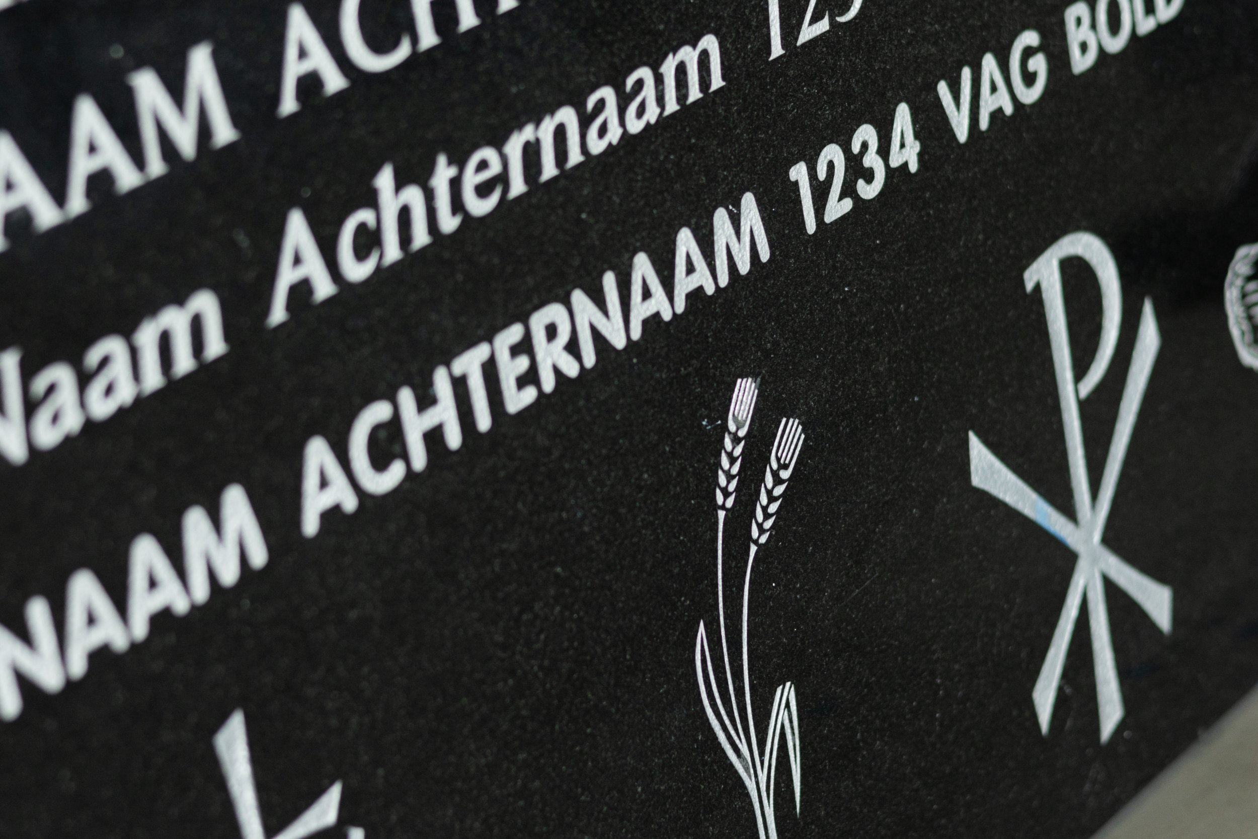 Wij bieden verschillende technieken aan, waaronder zandstralen, graveren, metaalletters (bijvoorbeeld brons of RVS) en belettering in eigen handschrift. De techniek is mede afhankelijk van het type steen en uw persoonlijke voorkeur.