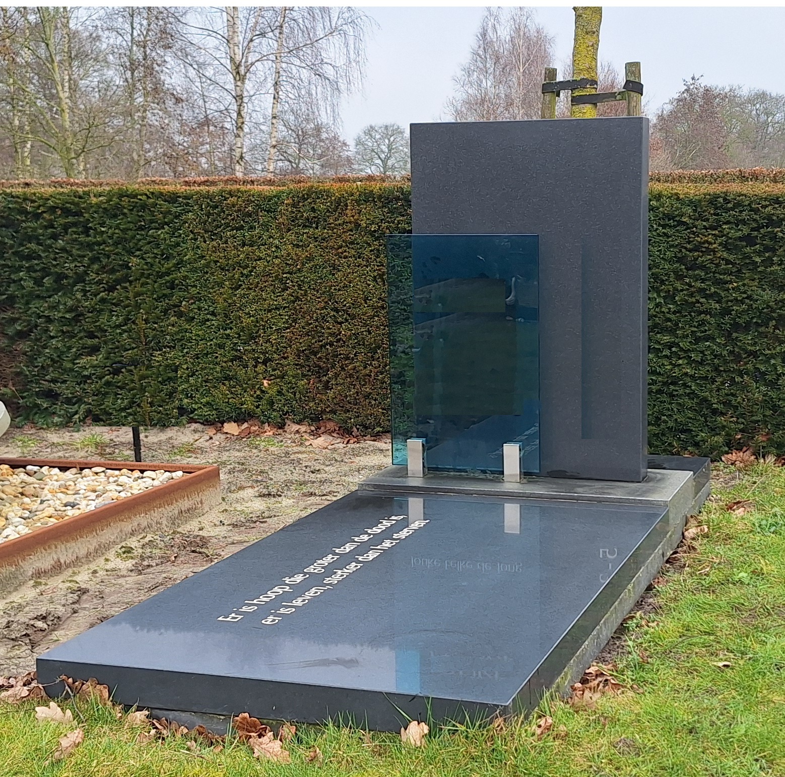 Prachtig exclusief grafmonument, Door de combinatie van zwart graniet met een glasplaat krijgt dit monument een moderne exclusieve uitstraling.