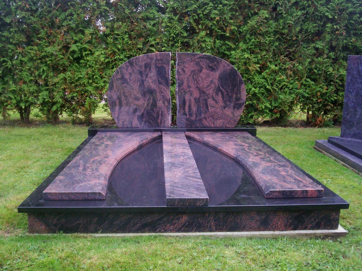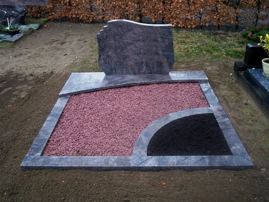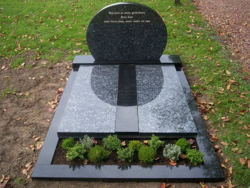 Grafsteen Havelte. Dit is een heel Robuust grafmonument van Aurora graniet en zwart graniet. De combinatie van Aurora en zwart graniet geeft een mooi chique uitstraling. De verdeling van halfronde dekplaten met een strakke afwerking geeft een bijzonder effect. Het geheel staat op plinten, daardoor lijkt het nog volumineuzer. De hoofdsteen bestaat uit twee delen.