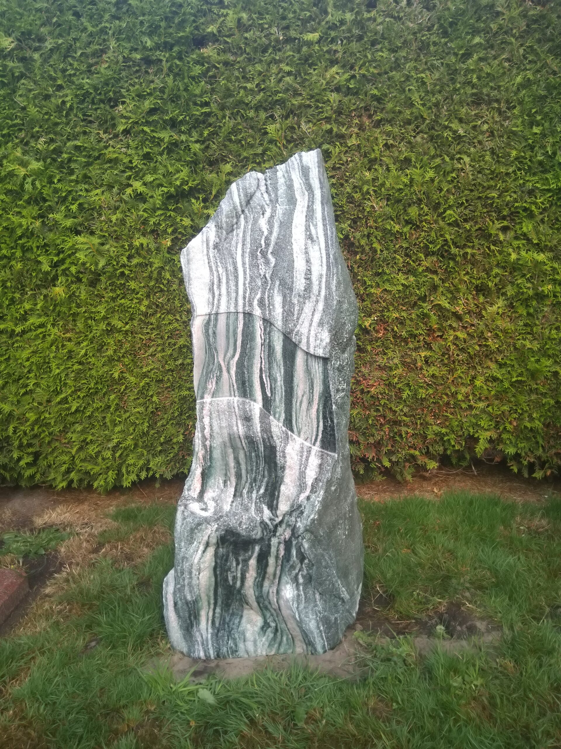 Mooie hoge grafsteen van Metallic green graniet, de grafsteen heeft aan de voorkant een gepolijste strook speciaal gemaakt voor het opschrift. Deze grafsteen staat opgesteld bij AB Grafstenen in Oudehaske. 55 cm breed, 135 cm hoog en 29 cm diep.