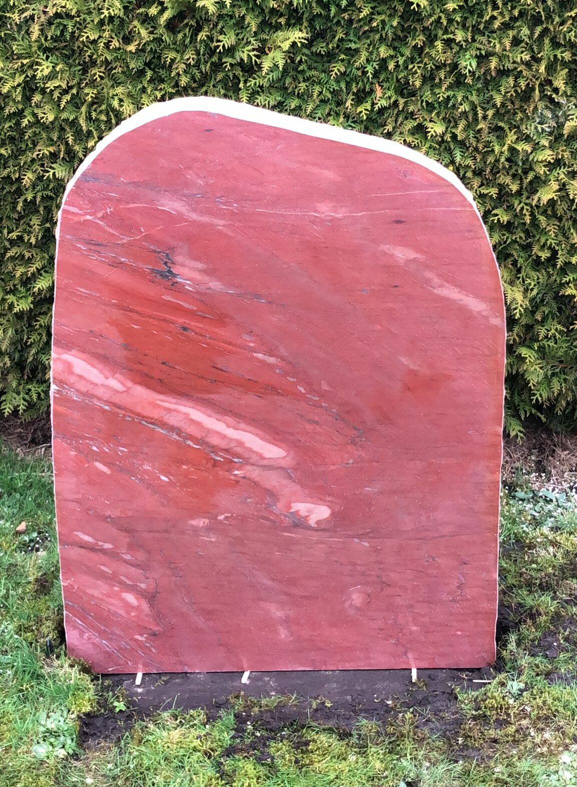 Een schitterende grafsteen van “Luna red” marmer meteen ruwe rand,